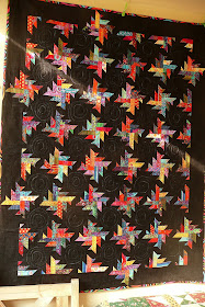Der Quilt hat einen schwarzen Hintergrund und das Muster ist sehr bunt. Die bunten Stoffe waren alles Kaffe Fassett Stoffe und der schwarze ist ein Makower Dimples. Die Rückseite ist auch ein KF-Stoff mit Überbreite (270cm). Den fand ich sehr passend zu dem Top, da es ja eine Decke ist. Der Abschlußrand habe ich aus den Resten der Rückseite gemacht.